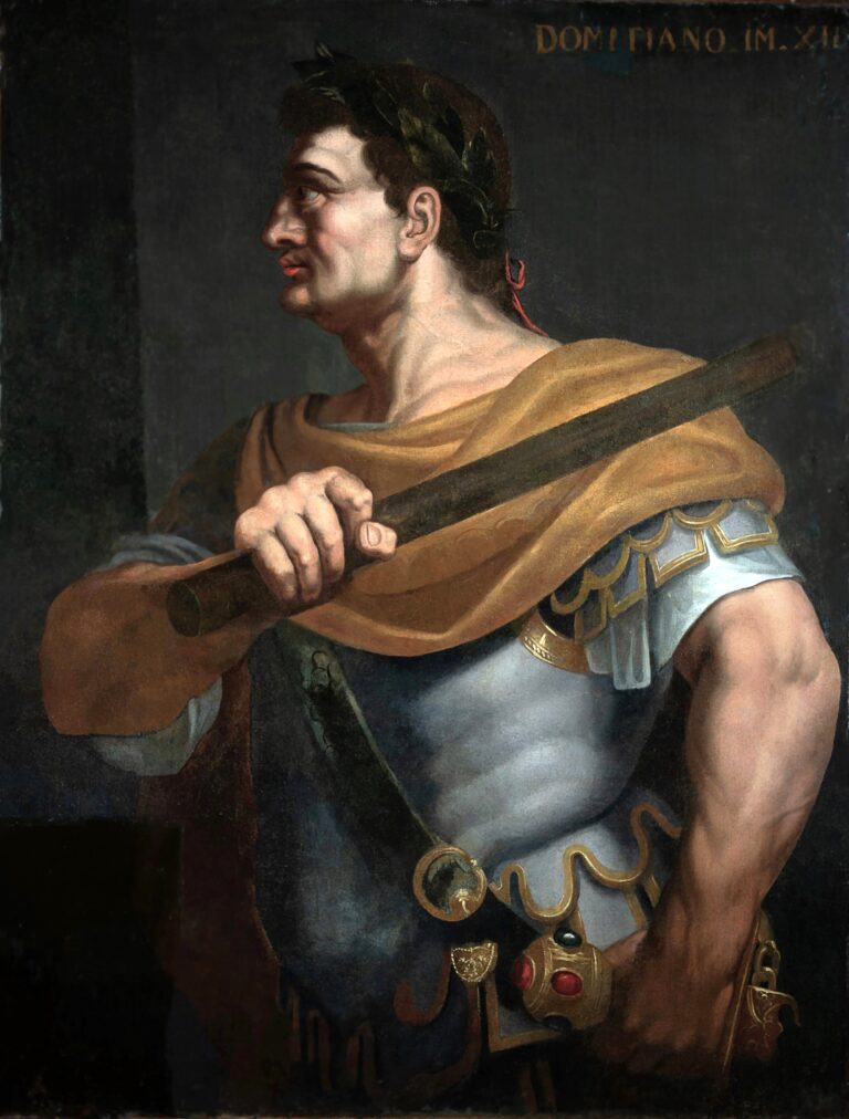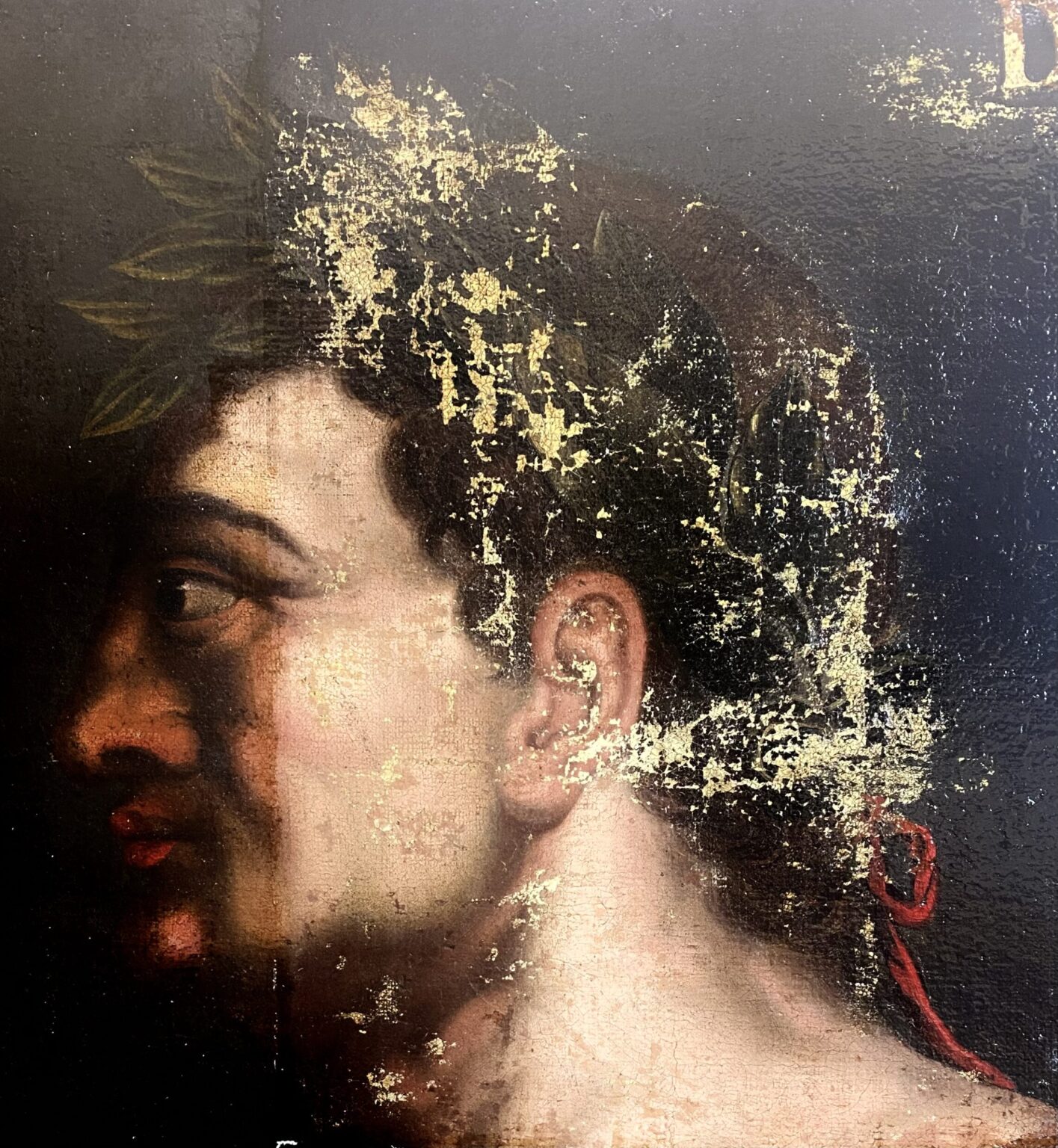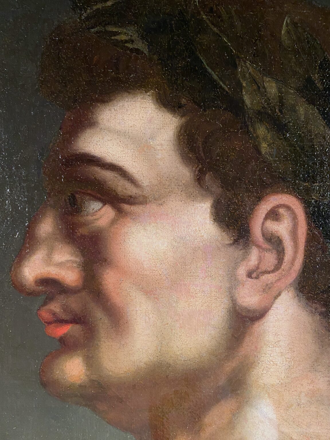 Oil on canvas, lined, 102.5 x 133 cm, depicting the Roman emperor Domitian. It is signed ”L da Vinci” with the underlined letters ”Pinxt” directly below.