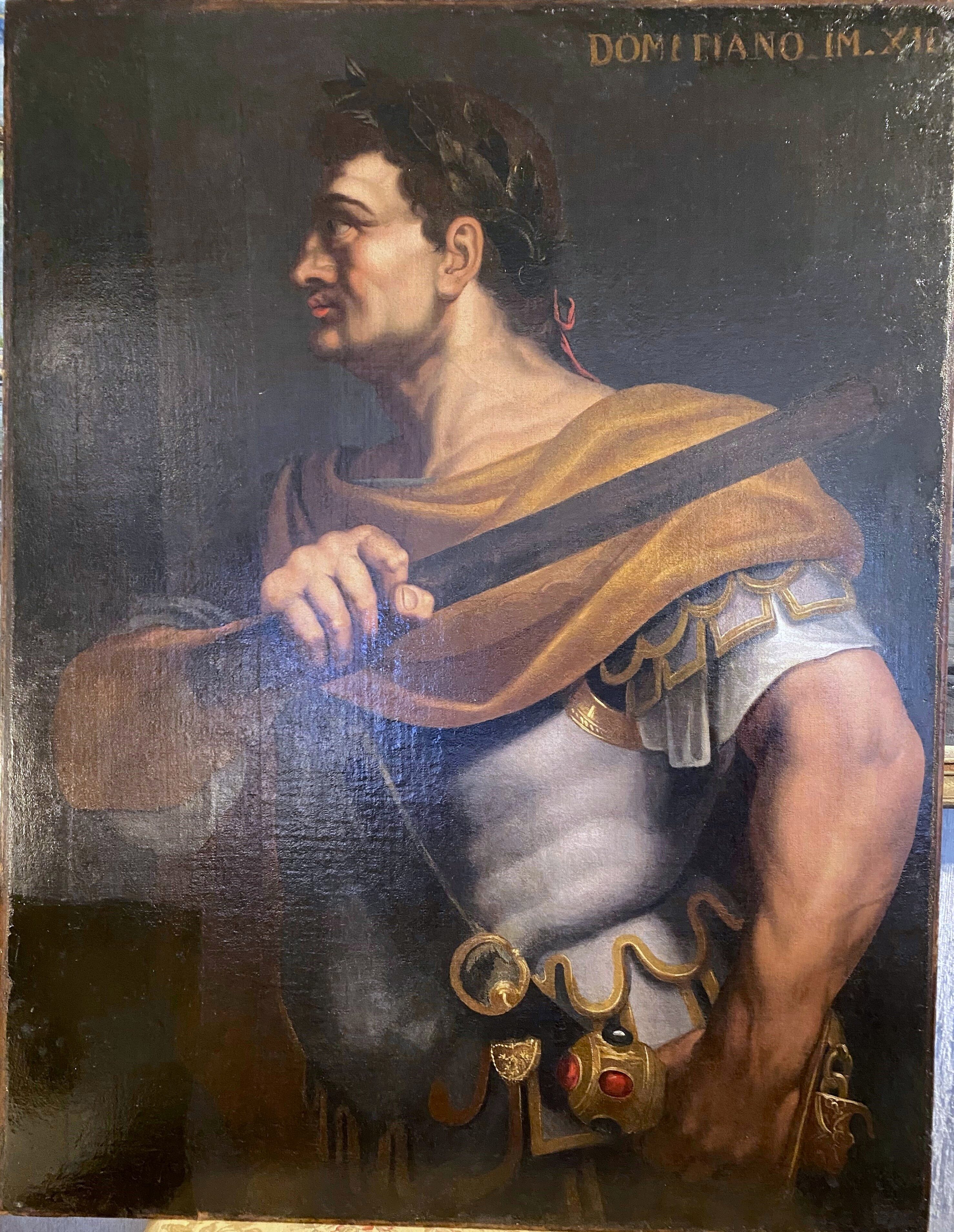 Oil on canvas, lined, 133 x 102.5 cm, depicting the Roman emperor Domitian. Signed ”L da Vinci” with the underlined letters ”Pinxt” directly below. ”DOMITIANO.IM.XII” is inscribed in the top-right corner and a partial inscription/mark is located in the lower-left corner.